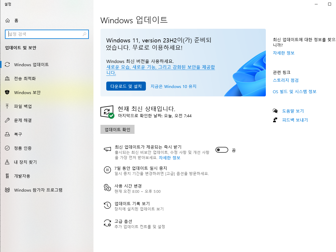 - 업데이트 및 보안 > Windows 업데이트로 이동합니다.