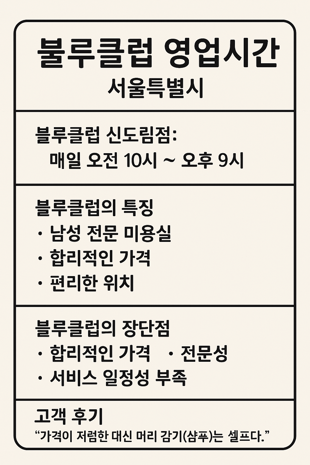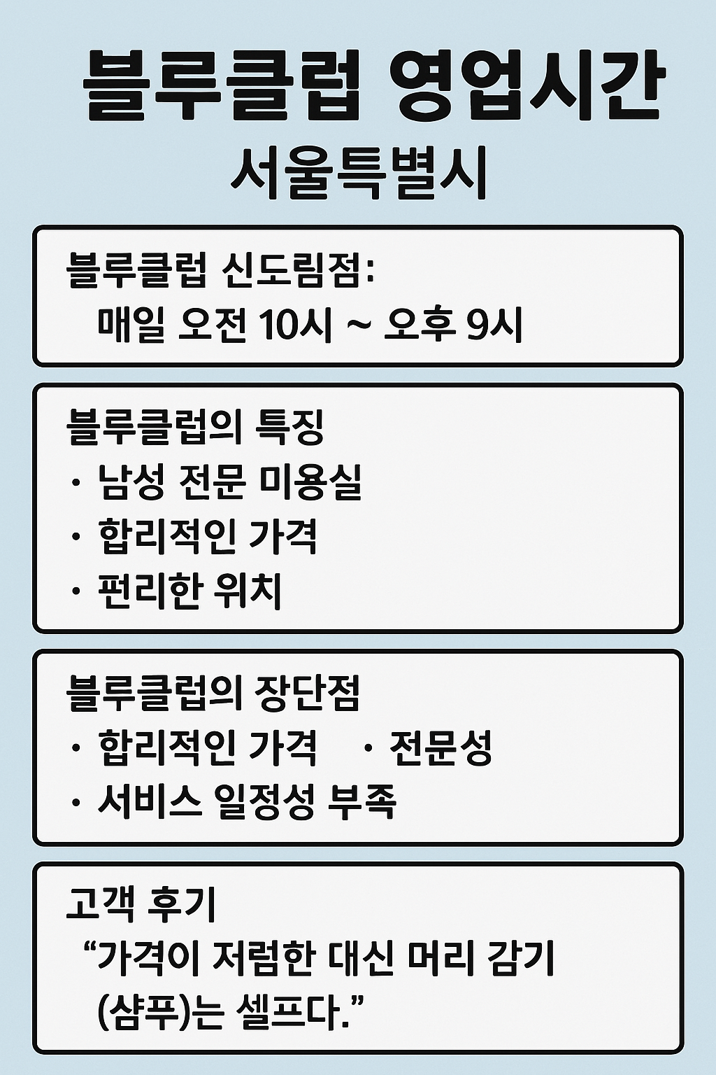 안녕하세요, 여러분! 오늘은 남성 전문 미용실인 블루클럽에 대해 자세히 알아보려고 합니다. 특히 서울 지역의 영업시간, 블루클럽의 특징과 장단점, 그리고 실제 고객들의 후기를 중심으로 이야기를 나눠보겠습니다.