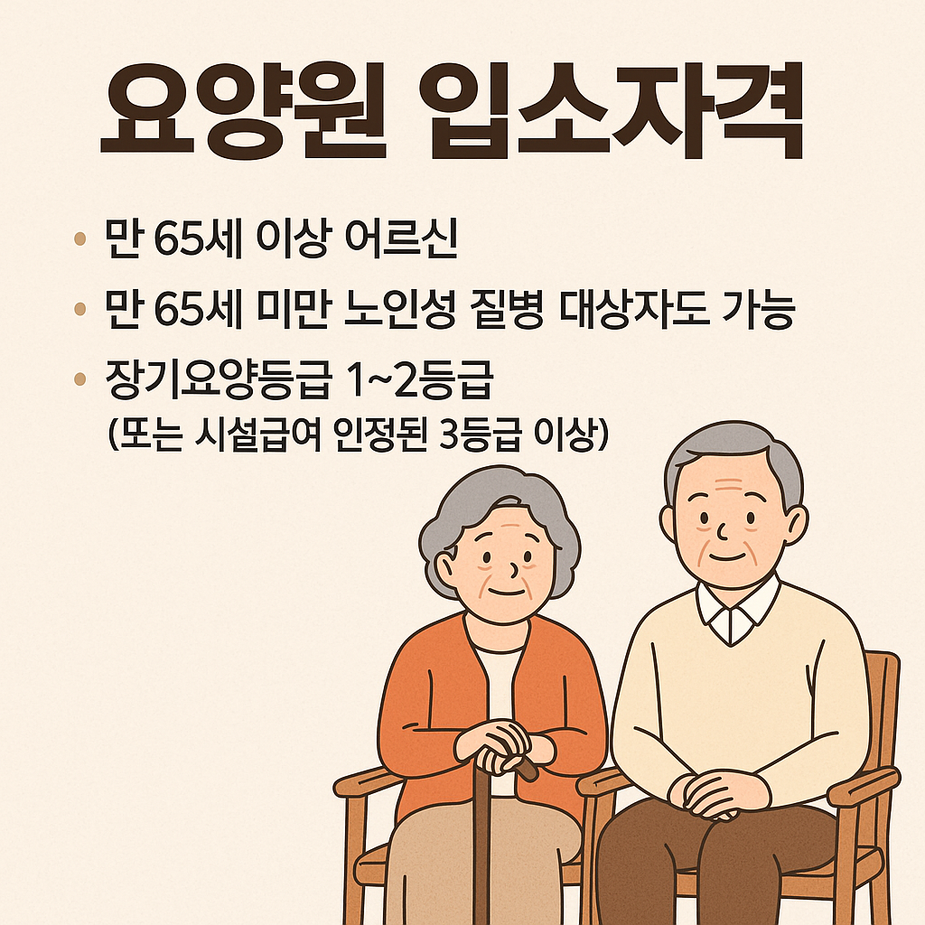 - 요양원 입소는 장기요양등급이 필요하며 1~2등급 또는 시설급여 인정된 3등급 이상이 대상입니다.