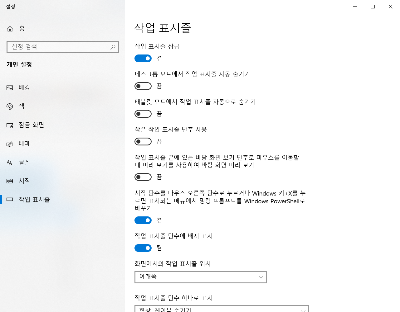 작업 표시줄 설정을 아래와 같이 변경해주세요!